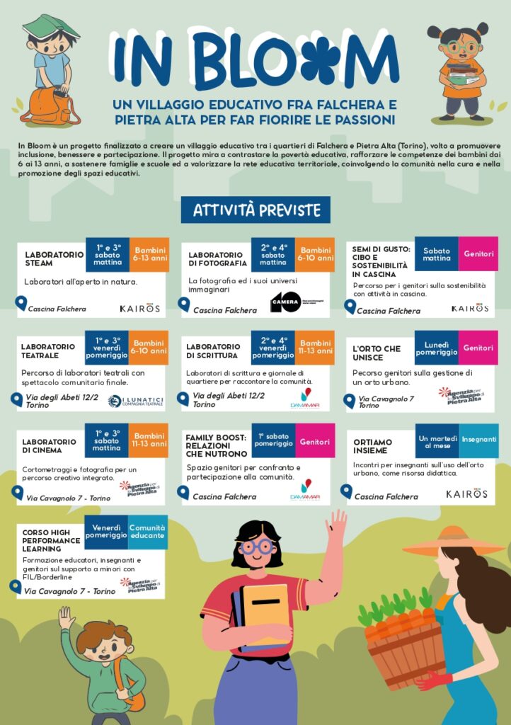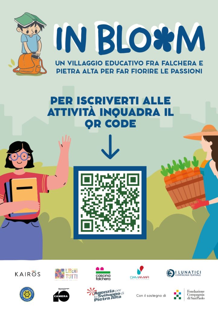 Damamar è partner del progetto In Bloom, promosso dal Consorzio Kairos, un percorso che nasce da una visione condivisa di comunità educante e che si intreccia con il tessuto sociale di Falchera e Pietra Alta trasformando il territorio in un vero e proprio villaggio educativo. Un ecosistema in cui scuola, famiglie, partner territoriali e ragazzi collaborano in modo coordinato.